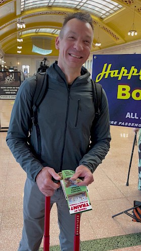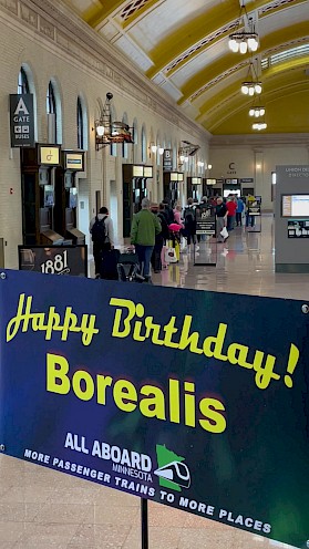 Borealis Birthday! Borealis celebrated its one year anniversary birthday today, and All Aboard Minnesota was on hand at St. Paul Union Depot to celebrate. We handed out candy bars to riders, and spoke with many of them. There were lots of first time riders this morning, who were excited to take a train rather than drive or fly! We can all be proud this train is such a success! Amtrak also published this press release to commemorate this anniversary: https://media.amtrak.com/2025/05/borealis-tops-205800-guests-at-first-anniversary/